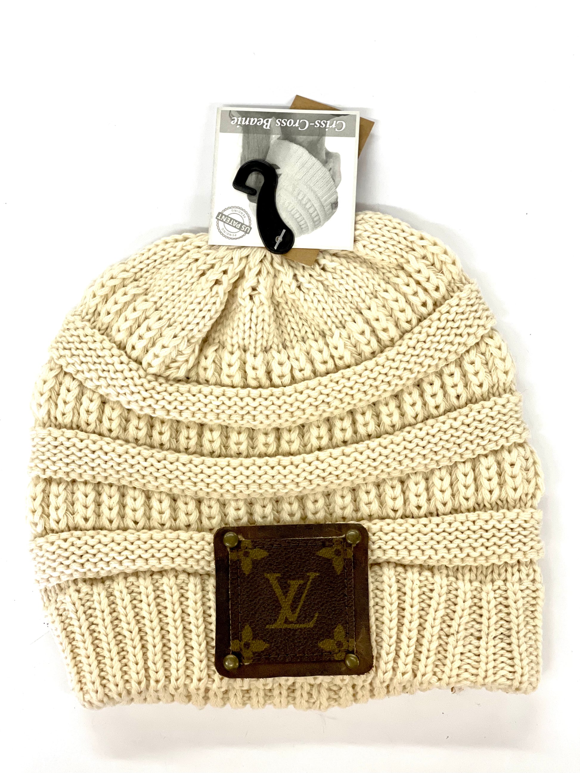 Cream Beanie (x-cross pony back) with brown patch antique hardware - Patches Of Upcycling