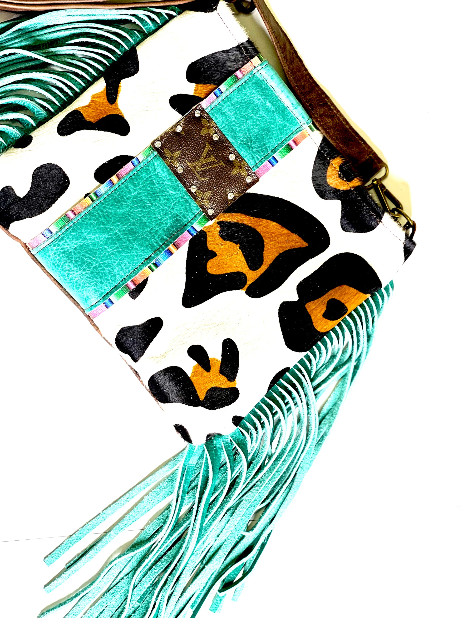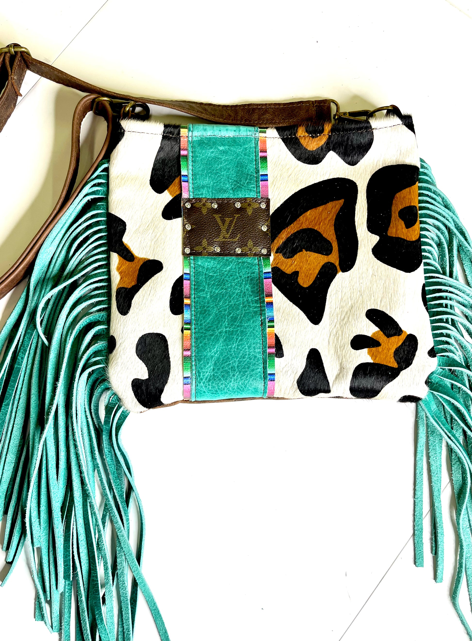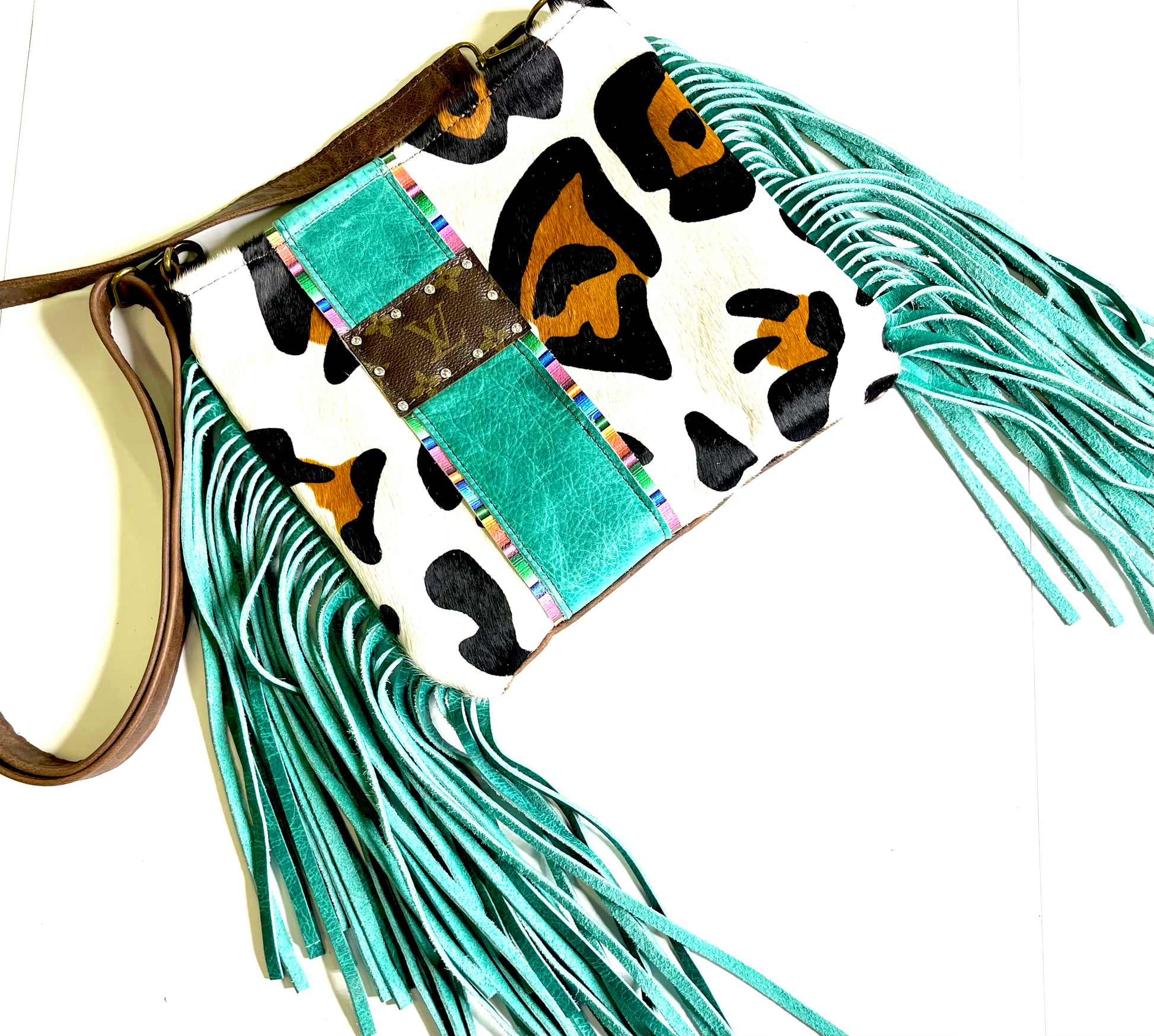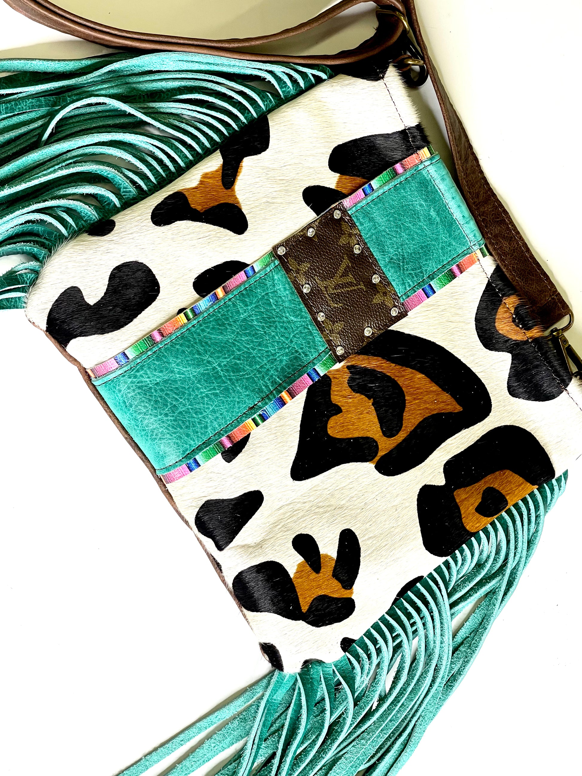 Medium Crossbody Xl leopard Leopard HOH in turquoise and serape rhinestone hardware - Patches Of Upcycling