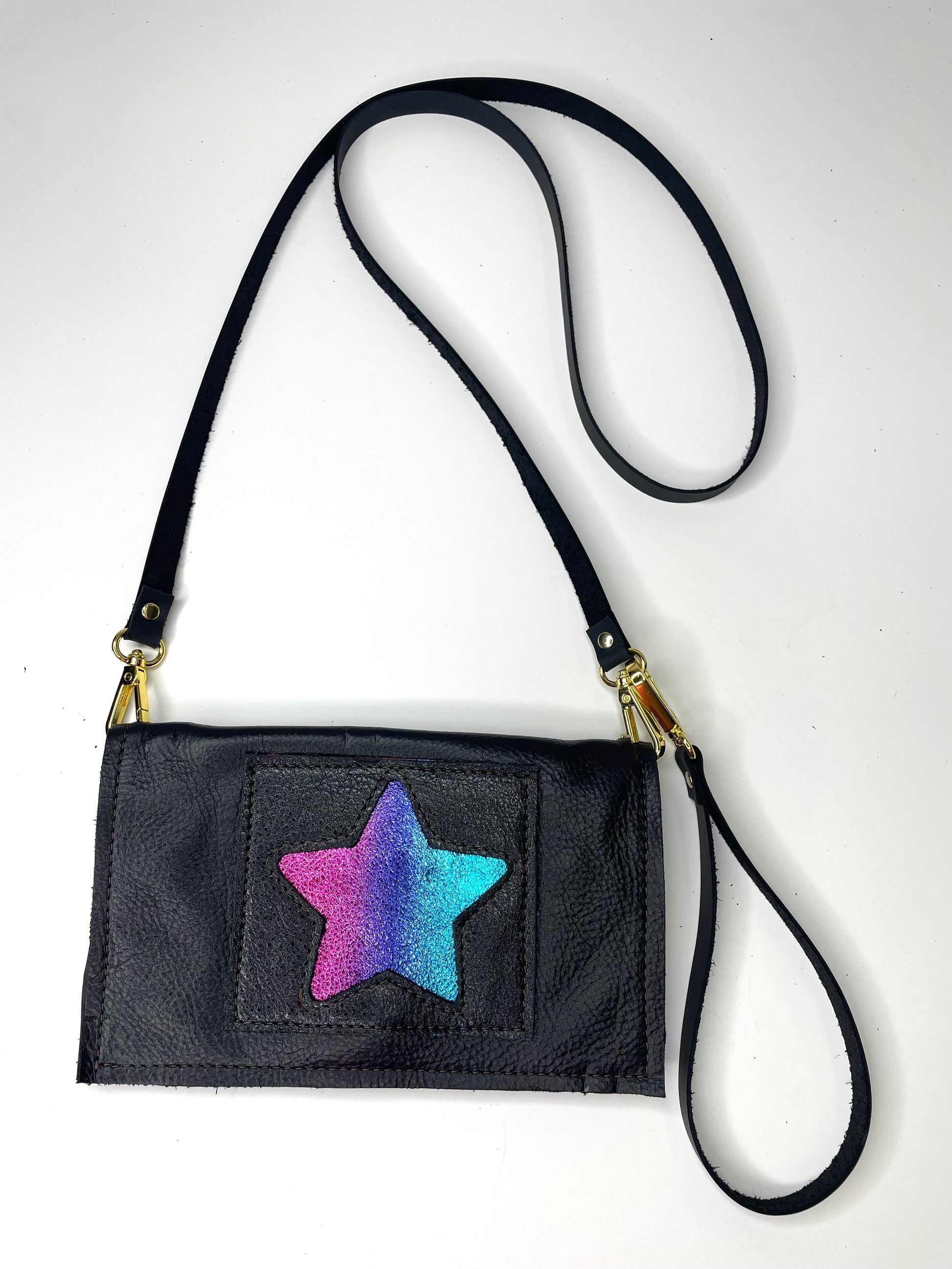 Small Crossbody black with black patch and rainbow star - Patches Of Upcycling